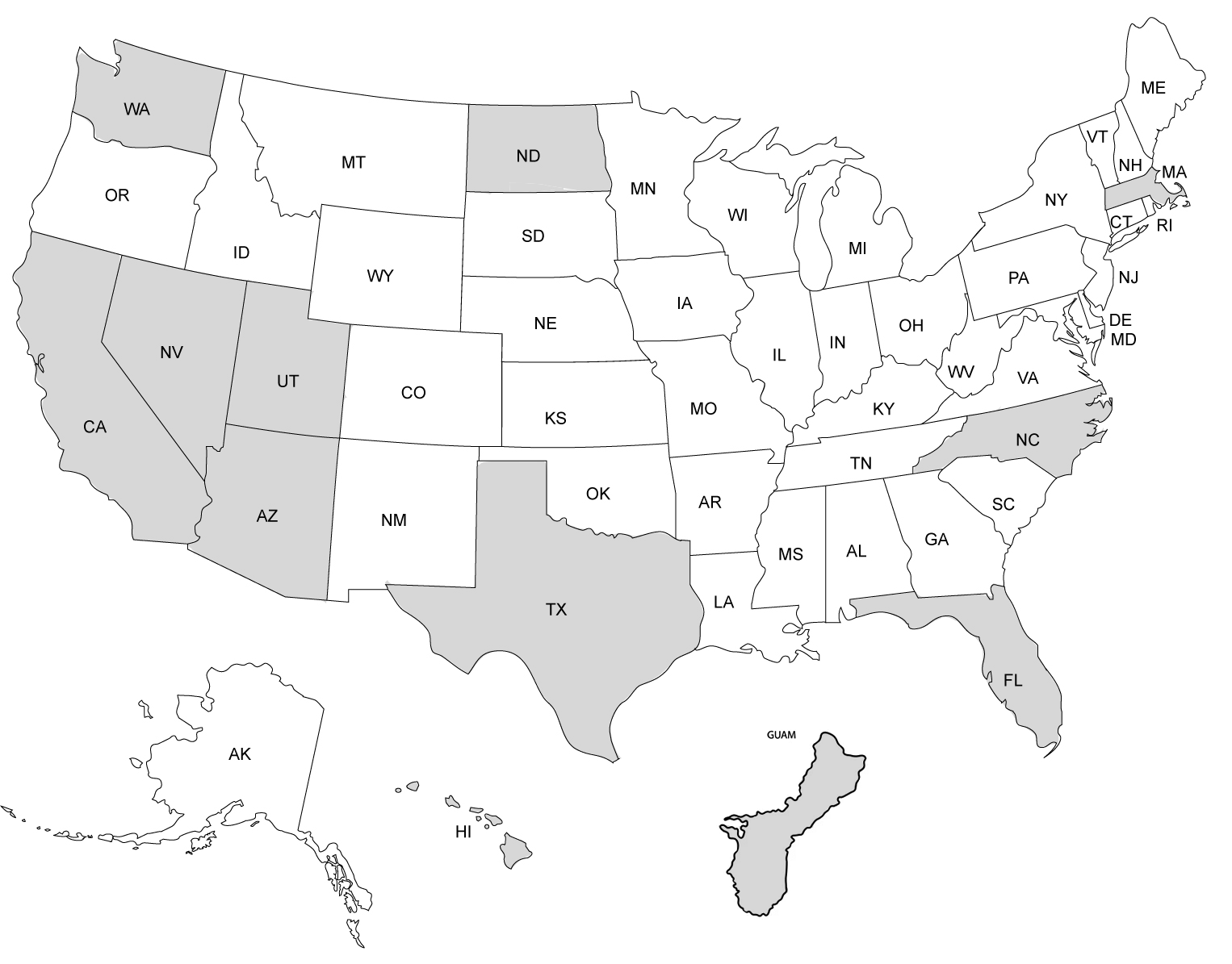 ARIZONA | CALIFORNIA | FLORIDA | GUAM | MASSACHUSETTS | NEVADA | NORTH CAROLINA | NORTH DAKOTA | HAWAII | TEXAS | UTAH | WASHINGTON